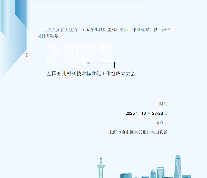 今日,全国介孔材料技术标准化工作组成立大会正式召开, 标志着我国介孔材料技术领域迈入标准化、规范化发展的新阶段。杭州复元先进材料科技有限公司荣幸当选工作组委员单位, 作为一家专注于介孔材料规模化制备生产与下游市场应用端合成技术研发,将深度参与介孔材料技术标准的制定与推广,为行业高质量发展贡献力量。